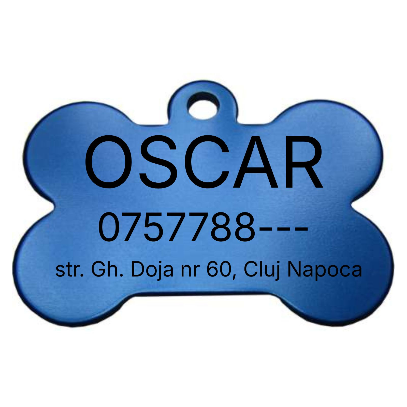 Poți grava numele câinelui, un număr de telefon și, opțional, adresa. Recomandăm informații clare și ușor de citit.