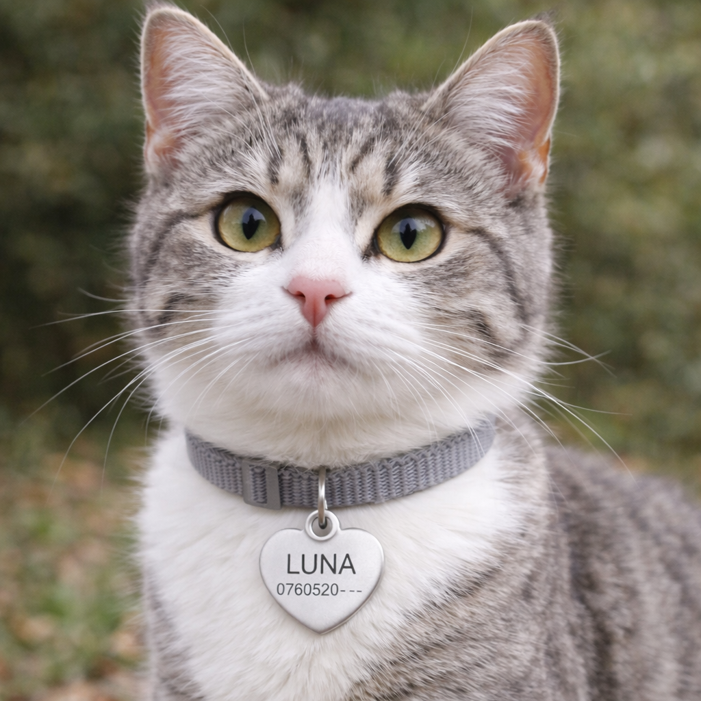 Gravura laser profesională, de culoare neagră, este clară și lizibilă, contribuind direct la recuperarea rapidă a animalului în cazul în care acesta se rătăcește.