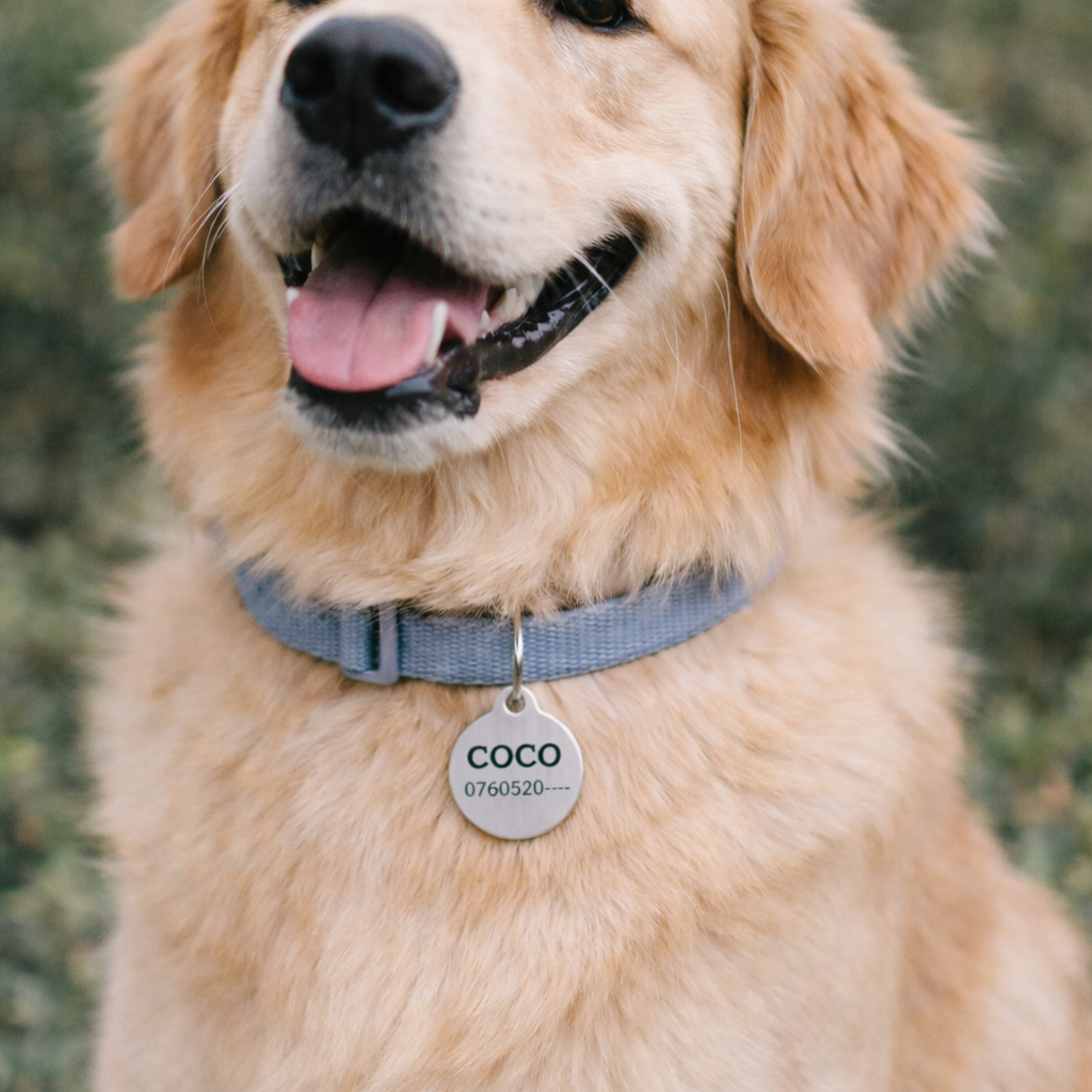 Poți grava numele câinelui sau pisicii și un număr de telefon. Recomandăm informații clare și ușor de citit.