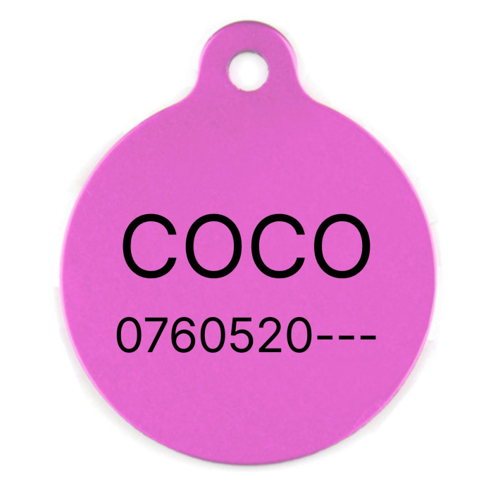 Medalionul personalizat rotund din aluminiu roz, cu diametrul de 25 mm, este o soluție practică, sigură și estetică pentru identificarea rapidă a câinilor și pisicilor. Datorită greutății reduse, este confortabil la purtare inclusiv pentru animalele de talie mică sau medie.